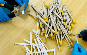 (写真)リサイクルが難しい歯ブラシのヘッドの部分を手作業でカットする様子