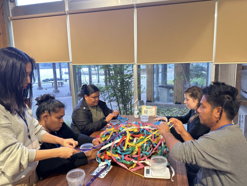 (写真)出船おくりの紙テープをアップサイクルしてポストカードを作っている様子